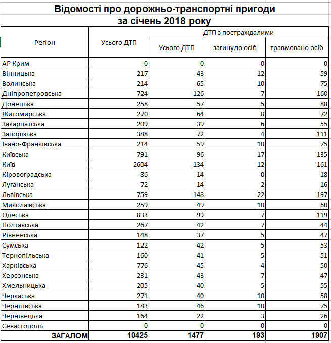 На территории страны в январе текущего года погибли 193 человека. Больше всего дорожных аварий зафиксировано в столице — 2604, а так же в Одесской (833), Харьковской (776) и Львовской (759) областях. Наибольшее количество погибших в результате ДТП было во Львовской (22) и Киевской (17) областях.