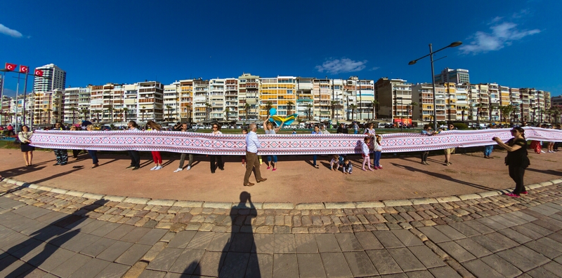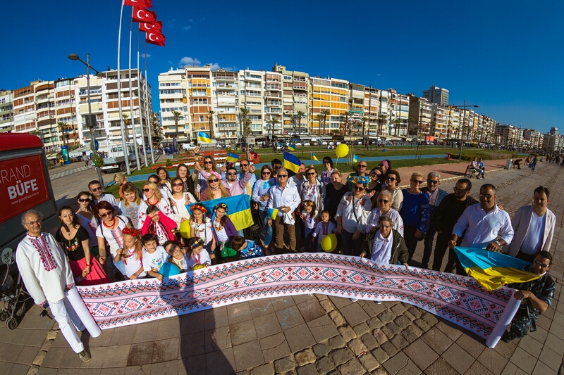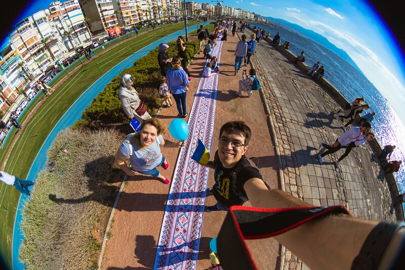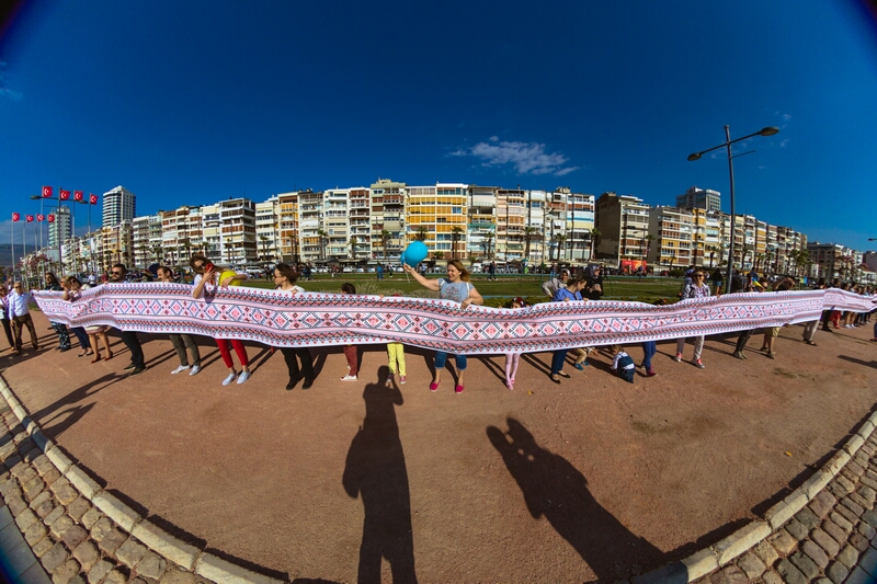 Почетное Консульство Украины в Измире вместе с Украинско-Измирским Клубом(УИК) отметили День Вышиванки в Измире(Турция) и продемонстрировали своеобразный рекорд – 50 метровый рушник украшенный украинскими национальными орнаментами. В этом культурном мероприятии, организованном Почетным Консульством Украины в Измире во главе с господином Четин Гюверджин и УИК, приняли участие большое количество украинцев со своими семьями и детьми. Праздник был проведен в самом прекрасном месте Измира, на Кордонском бульваре с разрешения официальных властей города. Уже 15 лет Почетное Консульство Украины в Измире проводит большое количество мероприятий сближающих Турцию с Украиной. Но самым «разноцветным» и живым из них стал День Вышиванки. На празднике окутанном орнаментами Почетный Консул Ч.Гюверджин сказал:
