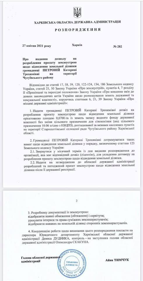Сегодня в социальных сетях появилась фотография распоряжения главы ХОГА Айны Тымчу о выделении гражданке Петровой Екатерины Трофимовне участка земли размером 7 соток в Старосалтовской территориальной общине. Земля выделяется без изменения назначения, а именно под сенокос.