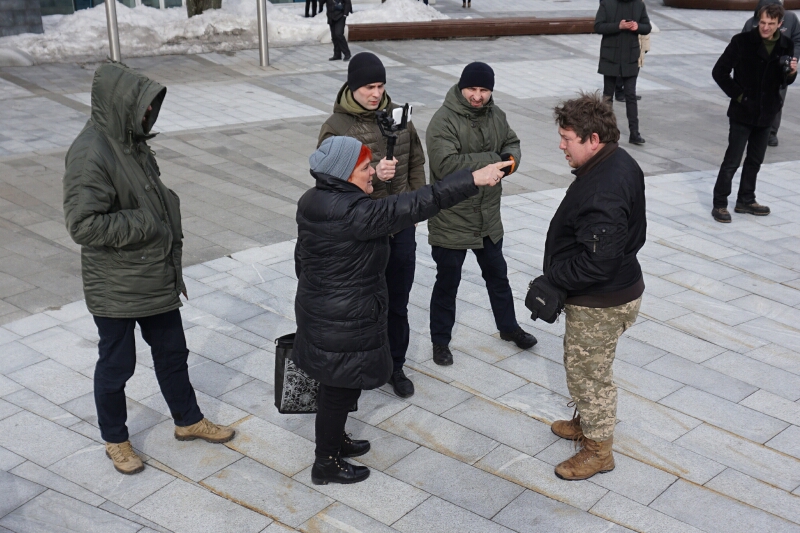 Проходившую мимо женщину пенсионного возраста, представитель митингующих обозвал провокатором и в достаточно грубой форме попросил пройти дальше. Следует все же отметить, что и гражданка вела себя достаточно вызывающе. Однако когда с похожими возражениями выступили ветераны АТО, этот «молодой человек» предпочел не вступать в дискуссию.