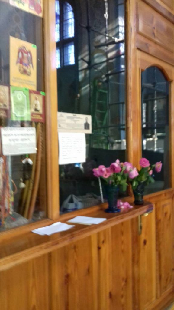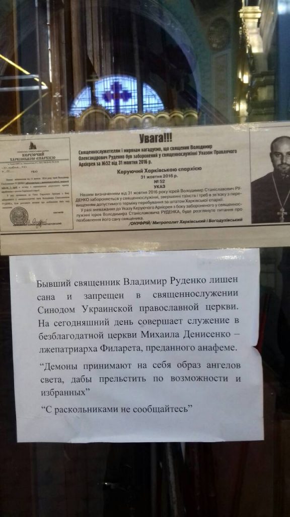 На прошлой неделе в храме Казанской Иконы Божией Матери, что на Лысой горе, появилось, мягко говоря, странное объявление. Размещено оно, это объявление на стекле иконной лавки храма и говорится в нем о том, что священник Владимир Руденко лишен сана, потому что проводит богослужения в церкви Киевского патриархата. Подписаны объявления управляющим Архиереем Епархии УПЦ Московского патриархата Онуфрием.
