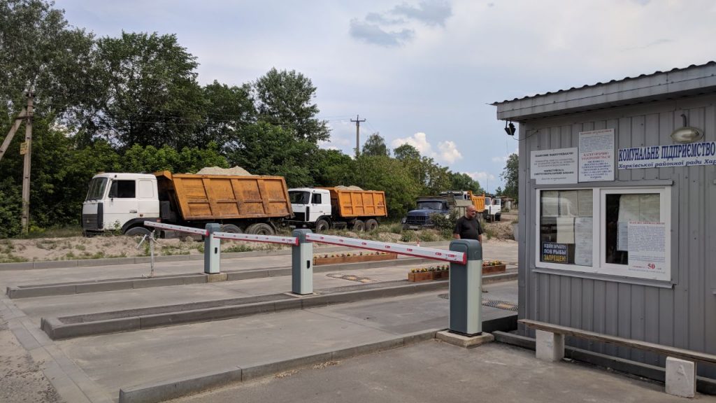 действия «коммерсантов». Пятнадцать автомобилей груженых свежедобытым песком остановлены на выезде с карьера.