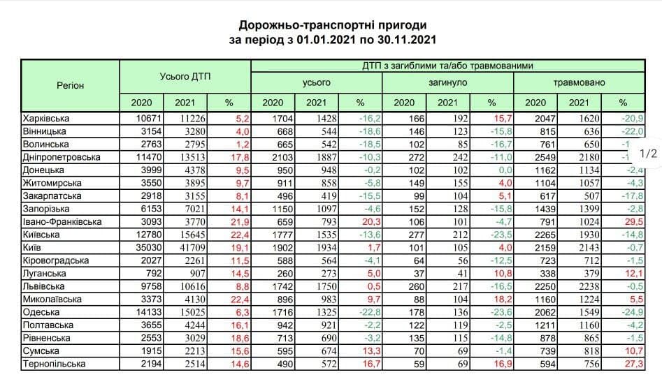Далі правоохоронці аналізують окремо систематизовані випадки та порівнюють їх з минулим роком. За даними Харківської статистики, внаслідок аварій загинули 148 осіб, у звіті Державної поліції — 192. Для порівняння у дужках написали, що за 2020 рік загинуло 105 осіб, але Державна Нацполіція говорить про 173 людини.