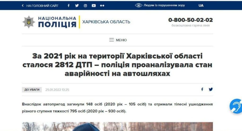 На сайті державної Нацполіції висить річний звіт за 2021 рік. У ньому сказано, що у Харківській області сталося 11 226 аварій. Якщо порівнювати з минулим роком, то це схоже на правду, адже за 2020 рік на Харківщині налічується 11 903 ДТП. Хто ж тоді бреше?