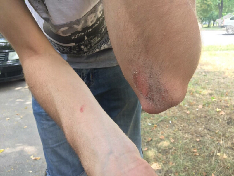 После этой фразы события начали развиваться как в боевике из жизни лихих 90-х. Сотрудник полиции, по неподтвержденным данным- командир роты Орач, подошел к активисту, сдернул с него солнцезащитные очки…
