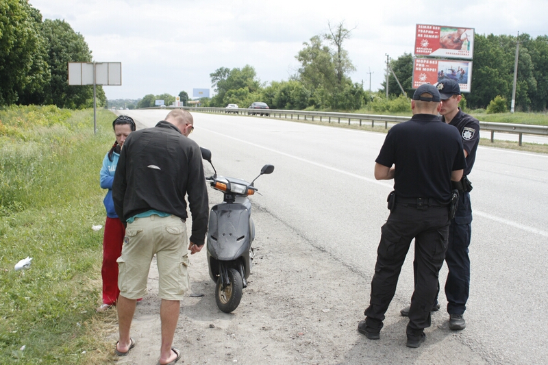 Наш корреспондент выехал на патрулирование автодороги Харьков-Киев и стал свидетелем составления первого протокола за административные правонарушения. Днем, около половины первого, на четыреста шестьдесят шестом километре автотрассы, связывающей Киев и Харьков, дорожными полицейскими был остановлен скутер, на котором отсутствовали номерные знаки. У водителя при себе не было никаких документов и кроме того, водитель и его пассажир ехали без шлемов. Во время общения сотрудников полиции и нарушителя возникли подозрения в том, что он находится в состоянии алкогольного опьянения. Полицейские предложили пройти освидетельствование на месте или в наркодиспансере. Прибор «Драгстер» показал превышение максимально разрешенного уровня алкоголя в крови почти в три раза. В результате, на водителя были составлены протоколы об административных нарушениях за управление транспортным средством без документов, в состоянии алкогольного опьянения, и за отсутствие средств защиты.