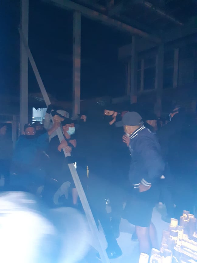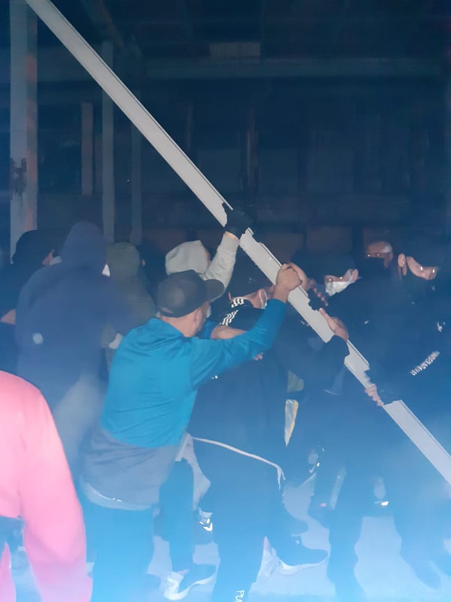 Около 2 часов ночи один из контролеров торгового центра увидел, как легковыми машинами к месту восстановления одного из торговых объектов подъехало около семидесяти человек спортивного телосложения. Строительно-восстановительные работы велись на объекте, пострадавшем в результате поджога 16 апреля 2020 года и находящемся на предполагаемом пути следования скандальной дороги через территорию торгового центра.
