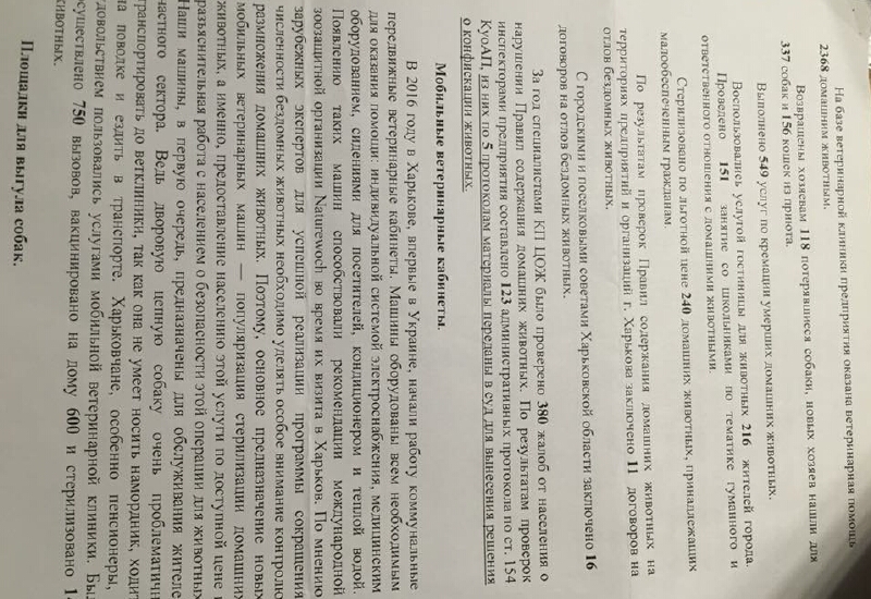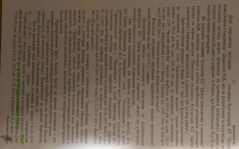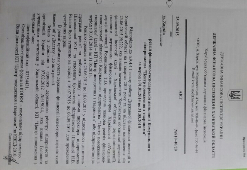 Получается интересная схема. Деньги, выделенные на деятельность КП и на стерилизацию, вакцинацию животных, а это миллионы, оседают в карманах директора КП Юлии Шаповаловой и ее подставного лица – Виктории Паневиной. Достаются немалые суммы и работникам-живодерам данного «псевдо-приюта». Почему оседают? Потому что, бездомные и пропавшие домашние животные уничтожаются практически по прибытии в «приют», то есть на них не тратятся выделенные средства. Тем более что КП «Центр обращения с животными» не платит налоги. Последнему есть подтверждение: проверка Государственной финансовой инспекции в 2015 году.