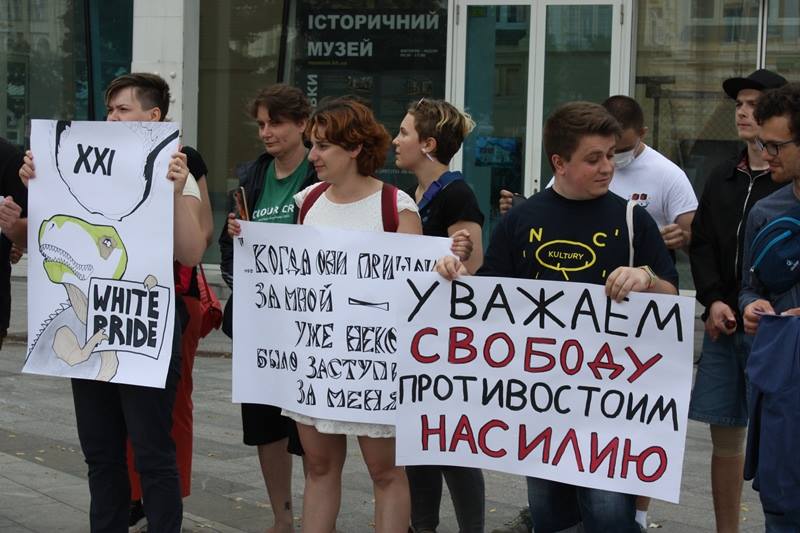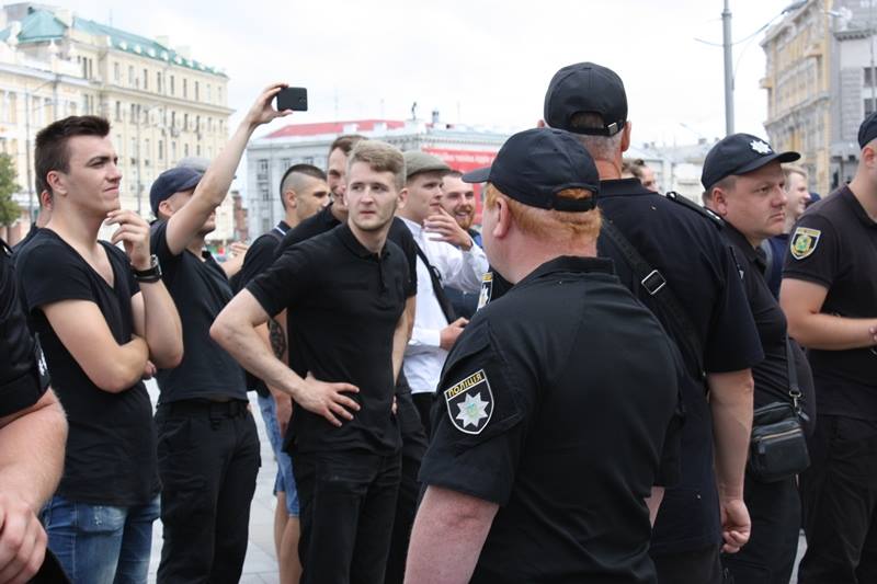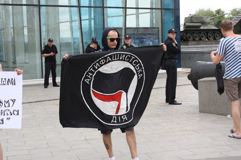 Окрім цього під час пікету виднілися прапор з анархістською символікою(об’єднання чорного кольору анархізму і червоного кольору соціалізму) та стяг «Антифашистської дії». На противагу цьому пікетові до будівлі Історичного музею вийшли представники правих угруповань Харкова («Фрайкор», «Традиція і Порядок», «Правий Сектор»), вони вважають проблему роздутою, а акцію – спробою розхитати ситуацію в країні та місті на користь ворогові, з яким Україна перебуває у стані війни. Попри напружену атмосферу серед учасників, котрі перебували по різні сторони від правоохоронців, акція пройшла мирно, опоненти обмінялися одне з одним гаслами, що декларують позиції їхніх рухів з приводу тих чи інших явищ. Була одна єдина спроба провокації зі сторони молодика, котрий тримав стяг «Антифашистської дії», однак правоохоронці миттєво зреагували й попередили ймовірний конфлікт.