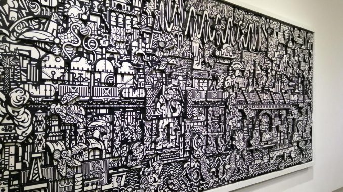 Роман Минин, который закончил харьковский Худпром — яркий представитель местной художественной школы — демократичный, веселый, умеющий “постебаться”. Например в работе, которая занимает всю центральную стену галереи художник иронично предлагает “найти Чужого”, вписав киношного монстра в свою работу, среди множества мелких деталей. Как в популярном интернет-приколе “найди кота”. Чужого, к слову, можно “расписать” тут же, его фигура выполненная из гипса служит книгой отзывов, где каждый посетитель может написать Роману свое пожелание.