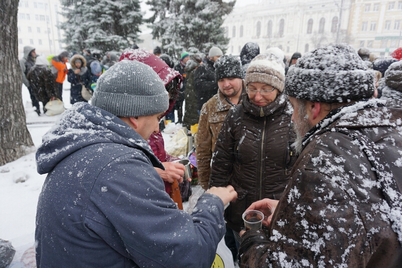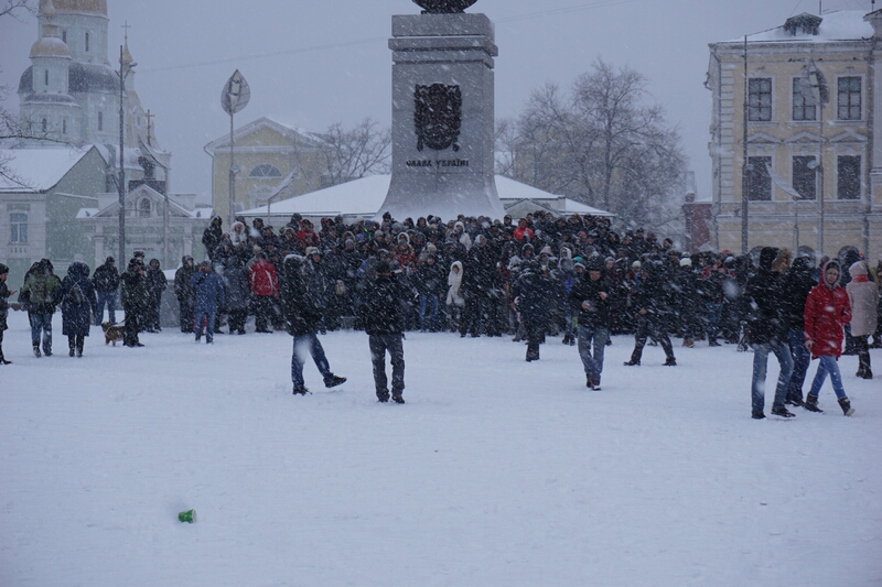 Как и было анонсировано в социальных сетях, в полдень рядом с историческим музеем в Харькове начали собираться люди с полными термосами кофе. Кроме кофе многие несли с собой и печенье, конфеты, шоколад. Собирались не на митинг, а просто поговорить, показать себя, да посмотреть в глаза друг другу. Не стал помехой падавший снег, иногда превращавшийся в настоящую метель. Люди общались, спорили, но не настолько горячо что бы таял снег, т.е. драк и размахивания руками не было, просто «высказывали свое мнение».