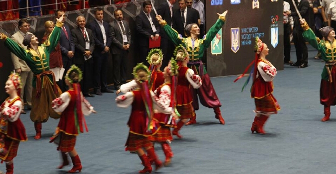 Гостей и участников соревнований поприветствовали участники большого ансамбля песни и пляски «Слобожанщина». Перед собравшимися выступили с украинским народным танцем лучшие танцоры Украины. После этого, Юлия Светличная зачитала приветственную речь участникам соревнований от Президента Украины.
