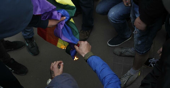 Скандуючи «Традиційна родина – сильна Україна» вони посунулись до опонентів, очевидь з не надто дружніми намірами. На заваді стала поліція. Та все ж прапори ЛГБТ було відібрано, привселюдно спалено та розтоптано.