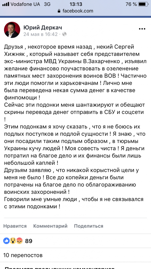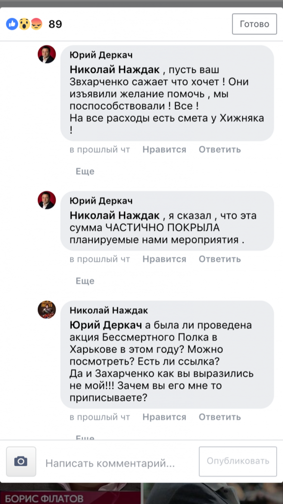 Смешно и увлекательно было читать в социальных сетях перепалку нашего харьковского полководца «Бессмертного полка» Юрия Деркача и беглого регионала Сергея Хижняка, который с 2014 года в Москве пытается притулится к кормушке, то Инал Ардзинба (администрация президента РФ), то Виталий Захарченко его кормят. Оказывается у них там, на России по смете проходят елки («Аллеи героев»), которые они высаживают в Украине к 9 мая. А потом не могут там они на Москве понять, сажали елки или нет. Да и вообще обидно оказалось – денег на потасовку возле могилок в Харьков дали, а на массовку с портретами вообще никто не вышел.