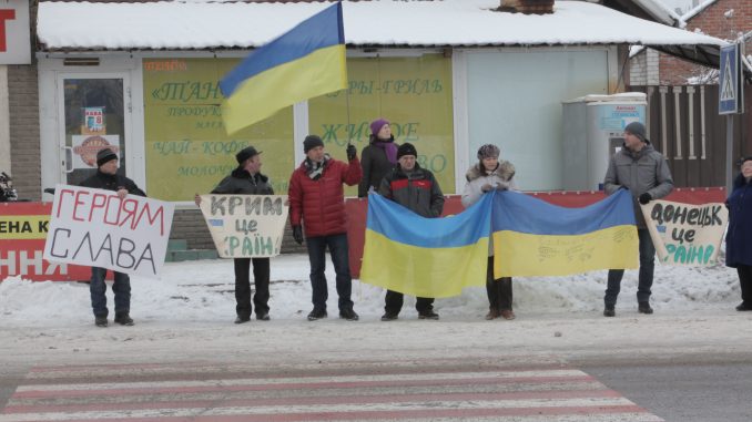 На это раз люди собрались вдоль трассы Харьков — Киев с флагами Украины, плакатами, на которых они выражают мнение многих украинцев: Україна єдина”, “Волинь — це Україна”, “Донецьк — це Україна”, “Крим — це Україна”.