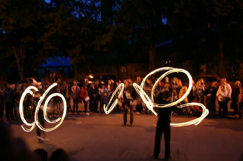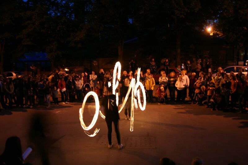 А завершающим штрихом к этой музейной ночи стали выставка фотографии в галерее «Академия»,  фаер-шоу студентов курса «новые визуальные практики». Фаер-шоу – это всегда зрелищно, и зрителей собралось посмотреть немало. Начали, конечно, чуть позже заявленной половины девятого, дожидаясь темноты, но результат того стоил. Сколь эффектно мелькают огни, прорезающие ночную темноту!