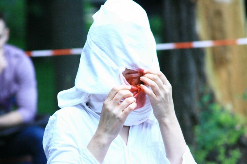 Затем, в Муниципальной галерее состоялся перформанс Ани Зур – киевского перформера, в рамках проекта Aspiration. Кто-то видел в этом острый социальный подтекст, кто-то – чистую эстетику, некоторые считали критикой власти. Действительно, проект назывался «Рідна калинова». Девушка широко известна различными акциями-манифестами, большинство из которых носит ярко выраженный социальный окрас. В своем перформансе у входа в «муниципалку», Ани сначала чистила калину, в белоснежной одежде, затем – замотав голову в белое – поедала калину, так, что буквально давилась, что стало очень важным смысловым акцентом, а далее – уже измазавшись в калиновом соке, словно в крови, отжимала ту белую ткань, что была на её голове. Зрители стояли чуть дыша, наблюдая за действом.