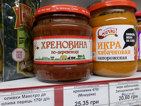 В супермаркетах и магазинах Харькова появилась в продаже странная консервация. Судя по этикетке, «Хреновина по-деревенски» занимает промежуточную позицию между икрой кабачковой и оливками «Маестро де олива». Ценовая категория так же промежуточная, около 25 грн за банку 470 гр хреновины красного цвета. Что содержится внутри банки неизвестно.