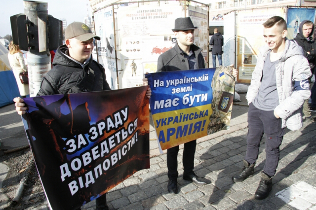 Вторым, а может быть и первым по численности собравшихся оказался пикет штаба «Нет капитуляции!». Представители правых, волонтеров и ветеранов АТО\ООС хотели получить внятные ответы на все вопросы, связанные с формулой Штайнмайера, разведением сил в зоне ООС, сдаче украинской земли.