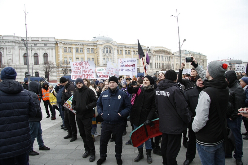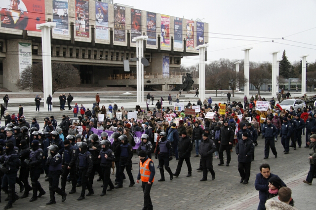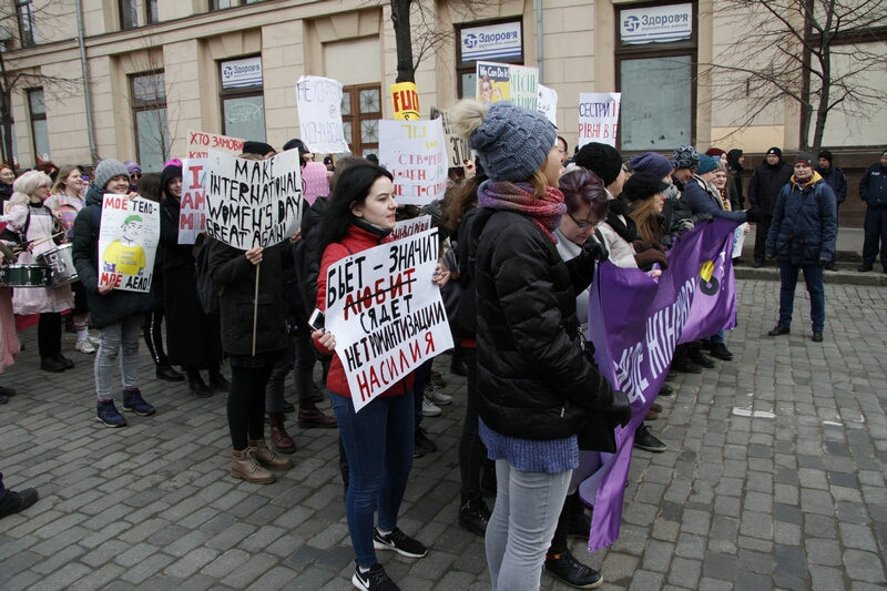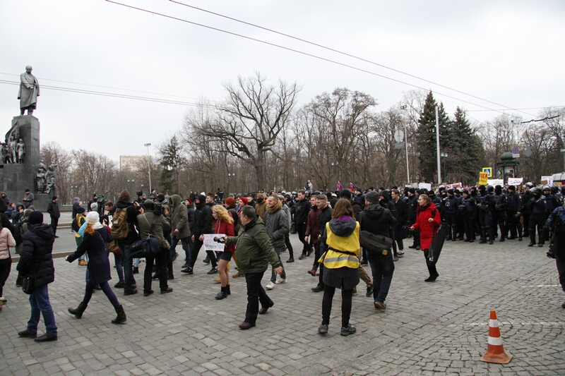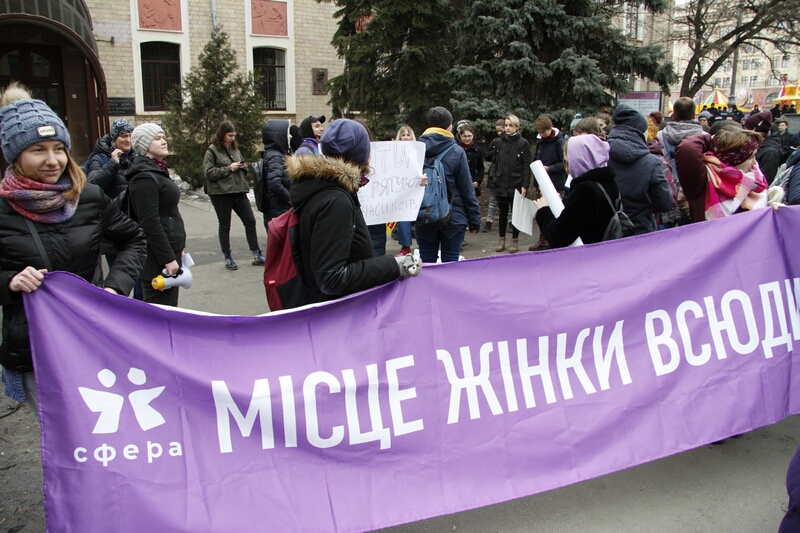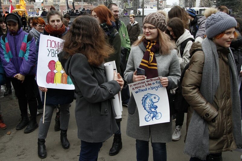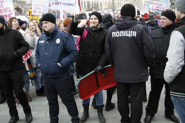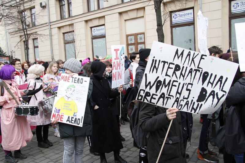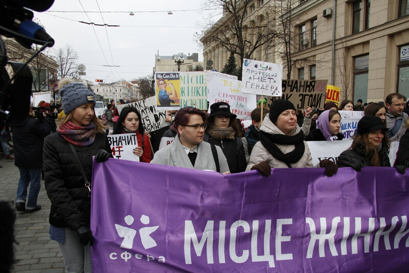 На марш под девизом «Место женщины — везде» пришли вместо заявленных тысячи человек всего около двухсот сторонников, а точнее сторонниц феминистического движения. На месте сбора, «марширующих» встречали более двух сотен полицейских экипированных для отражения любой агрессии в их адрес. Под грохот барабанов, выкрикивая в мегафоны лозунги «Место женщины везде», «Мое тело — мое дело», «Нет сексизму» и прочая, прочая колонна состоящая в основном из женщин и девушек двинулась от площади Свободы к пощади Конституции по проезжей части улицы Сумская. Сотрудники полиции, став двойной шеренгой во главе шествия, образовали оставшимися силами «коробочку», сквозь которую провокаторам было бы сложно проникнуть.