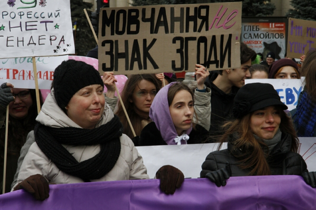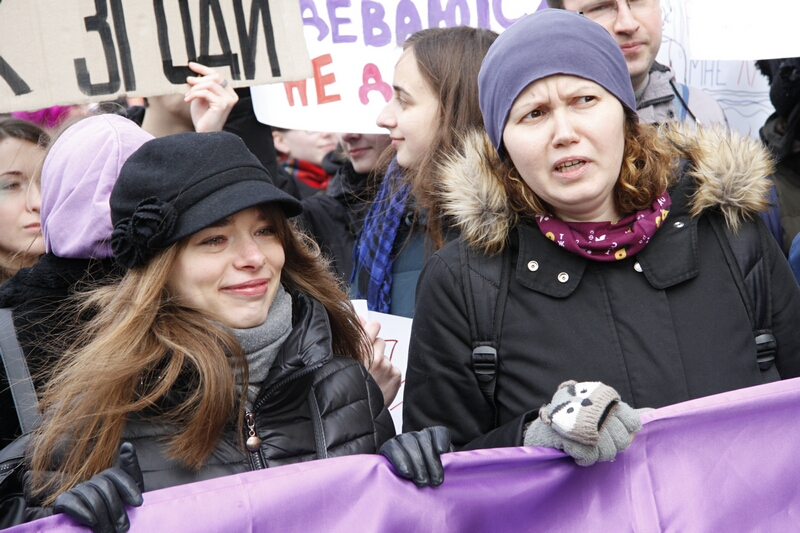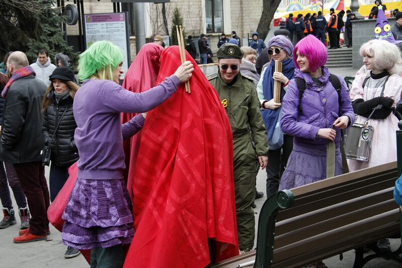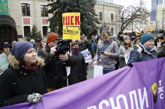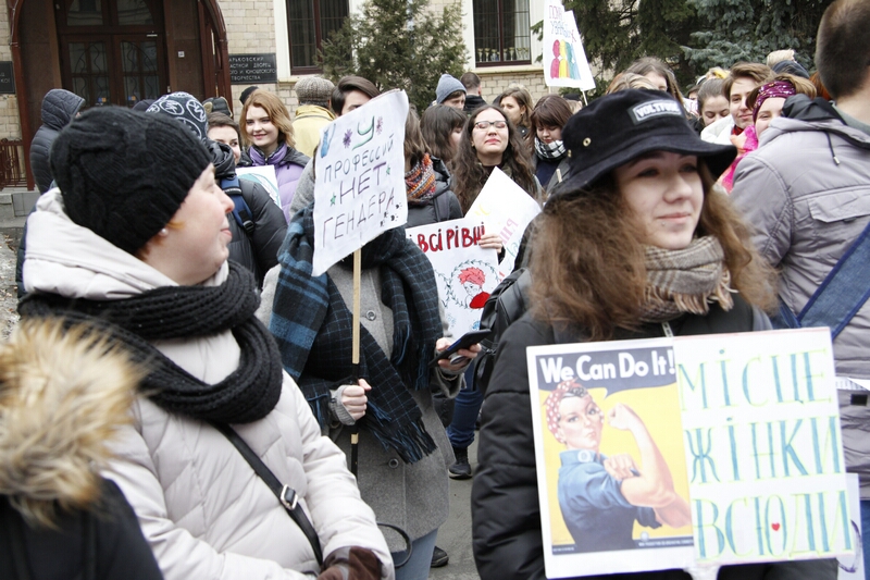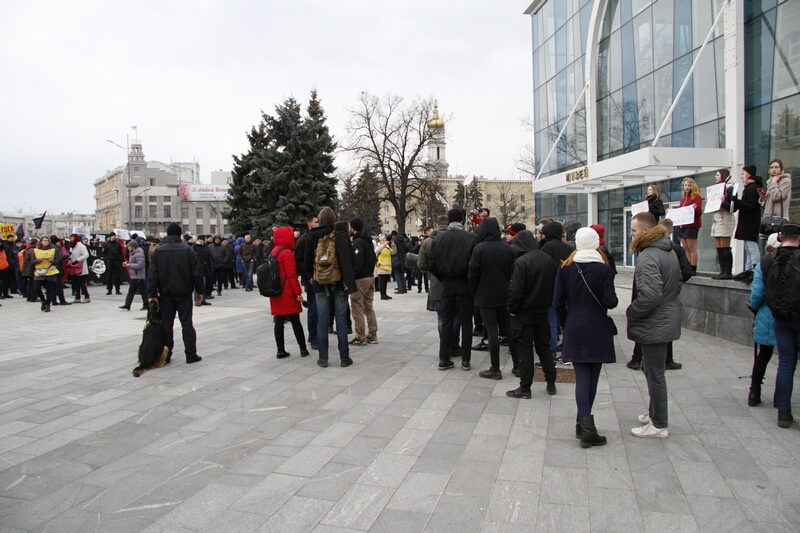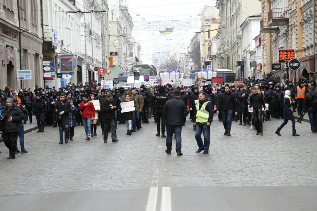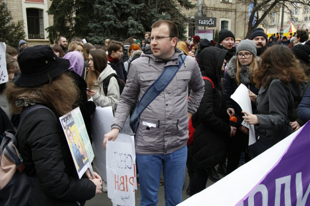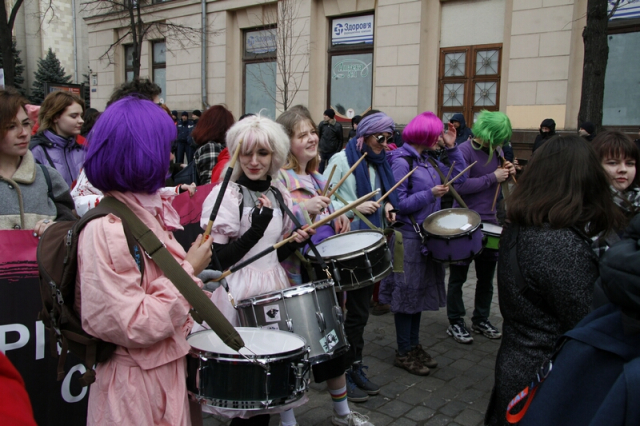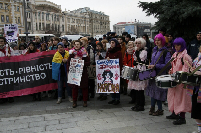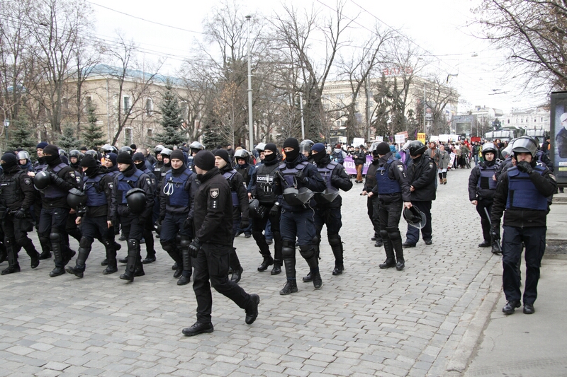 На марш под девизом «Место женщины — везде» пришли вместо заявленных тысячи человек всего около двухсот сторонников, а точнее сторонниц феминистического движения. На месте сбора, «марширующих» встречали более двух сотен полицейских экипированных для отражения любой агрессии в их адрес. Под грохот барабанов, выкрикивая в мегафоны лозунги «Место женщины везде», «Мое тело — мое дело», «Нет сексизму» и прочая, прочая колонна состоящая в основном из женщин и девушек двинулась от площади Свободы к пощади Конституции по проезжей части улицы Сумская. Сотрудники полиции, став двойной шеренгой во главе шествия, образовали оставшимися силами «коробочку», сквозь которую провокаторам было бы сложно проникнуть.