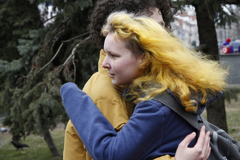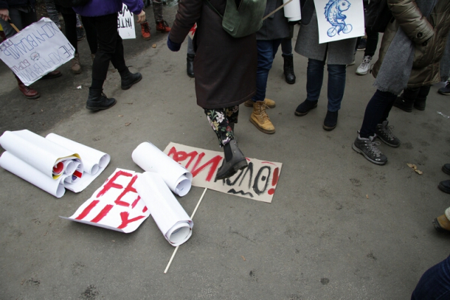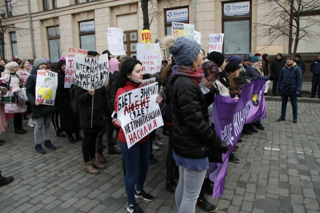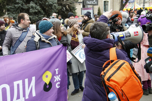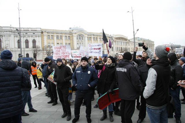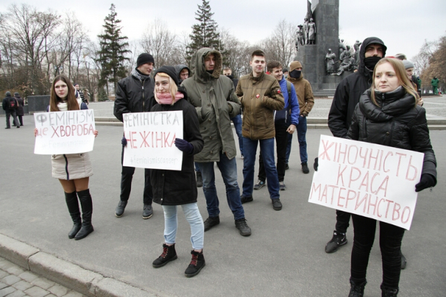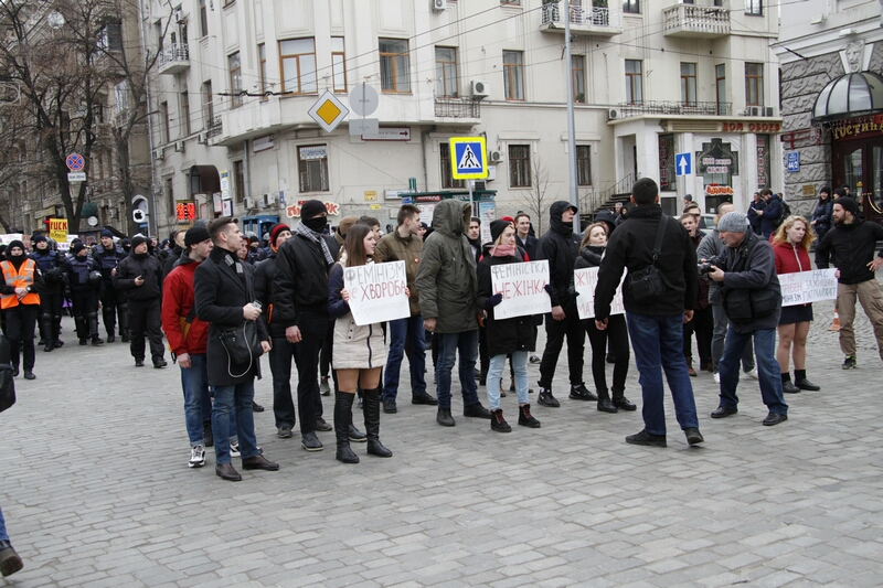 Возле памятника Тарасу Шевченко двигавшееся шествие ждала небольшая горстка правых, в основном представителей ОО «Фрайкор». Их девушки держали лозунги антифеминистического содержания, а молодые люди скандировали «Феминизм – это болезнь» и «Нации необходимы матери и дети». После чего около тридцати человек встали перед двойной шеренгой полицейских и пошли вниз по Сумской. Во время движения колонны состоящей из феминисток и их противников, разделенных полицией никаких эксцессов не произошло.