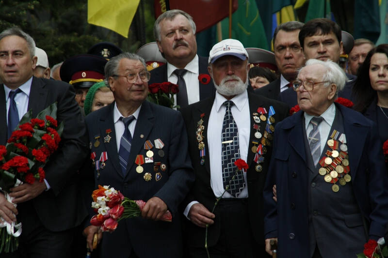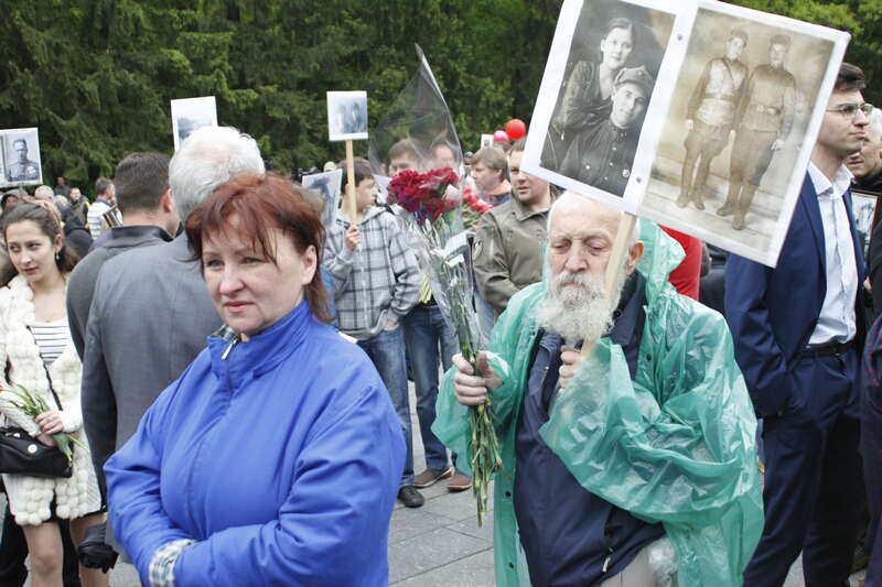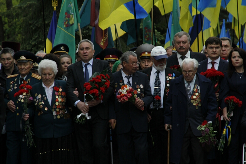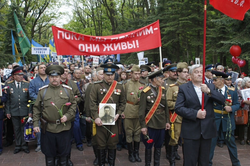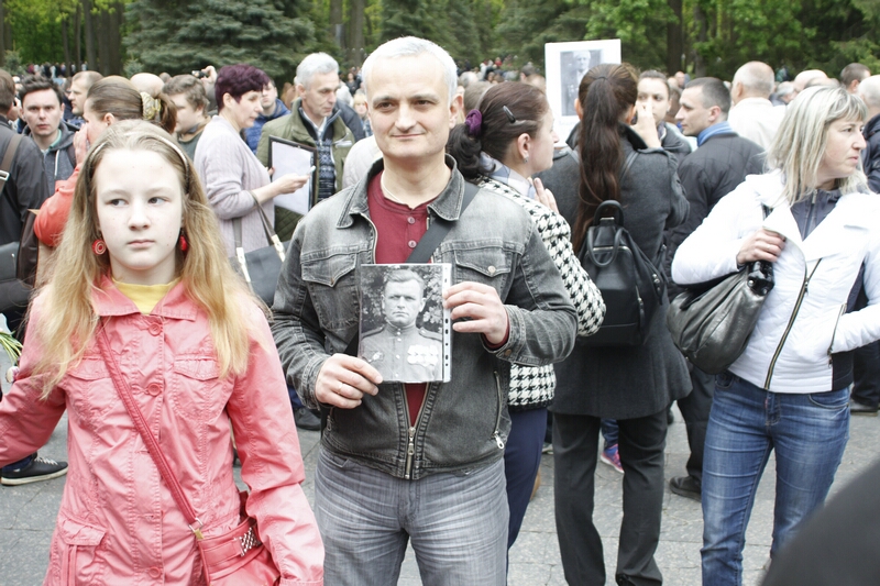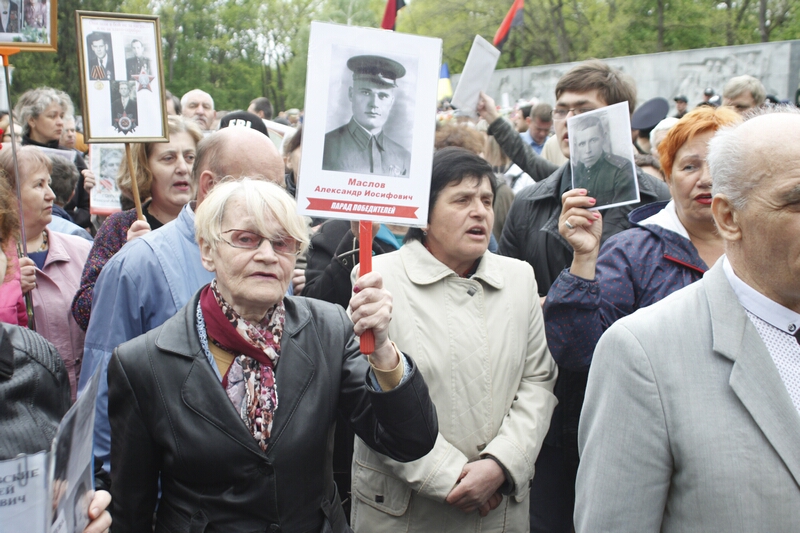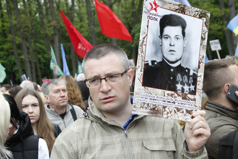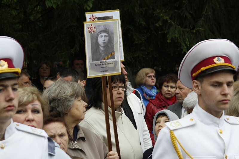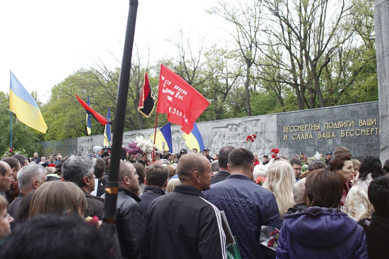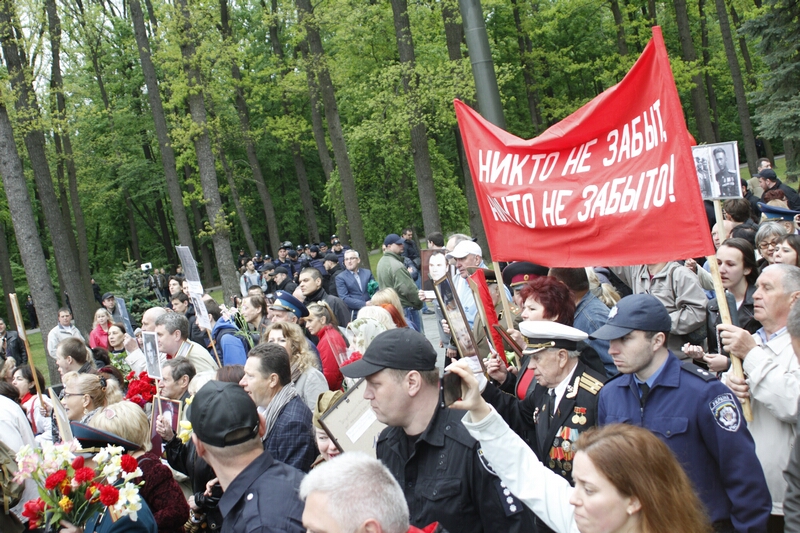 В толпе, устремившейся возлагать цветы, над головами «гордо реяли» портреты с георгиевскими ленточками и надписями «Бессмертный полк». Как туда затесались портреты героев погибших во время проведения АТО — остается загадкой. Но ветераны современной войны, которые принесли портреты своих побратимов, очень скоро вышли из пропитанной коммунистическими идеями толпы и стали в стороне от памятника.
