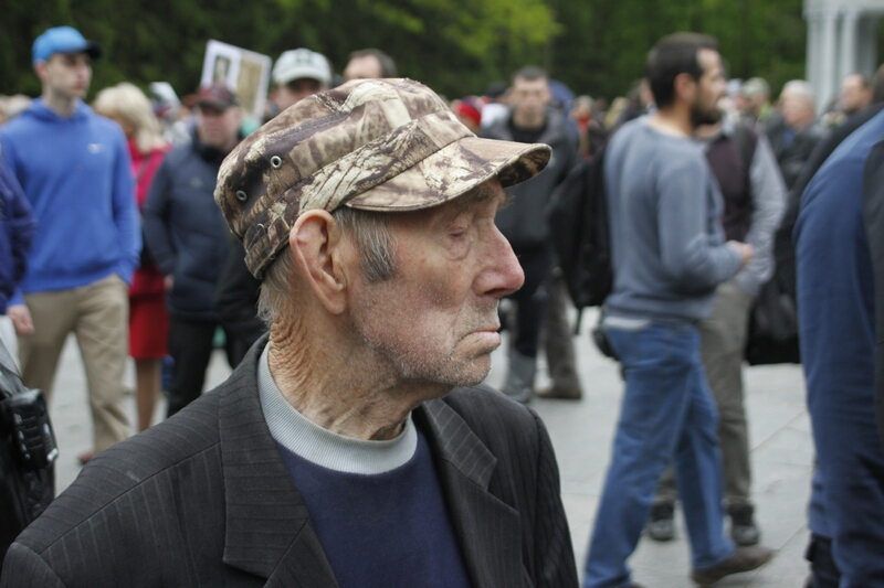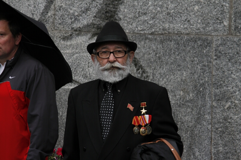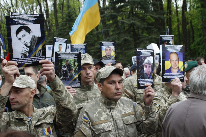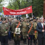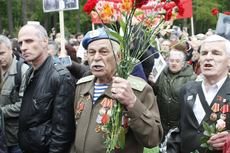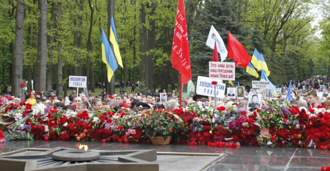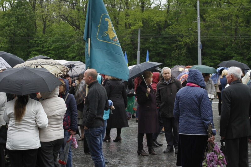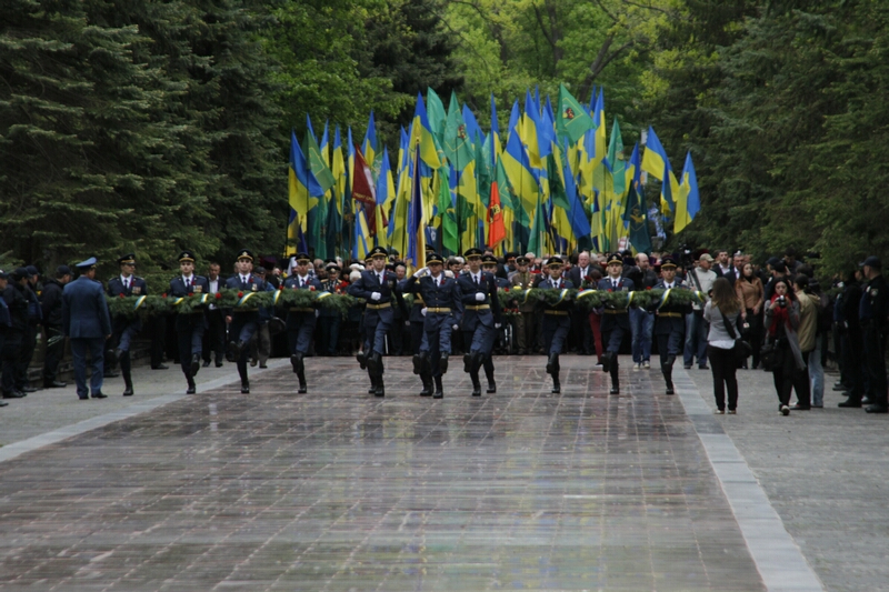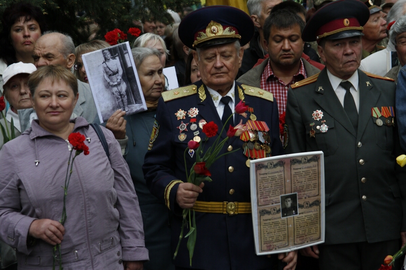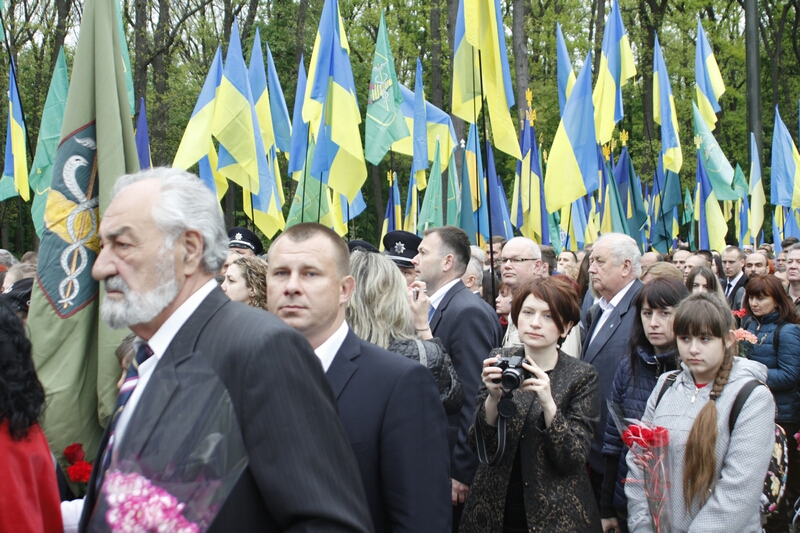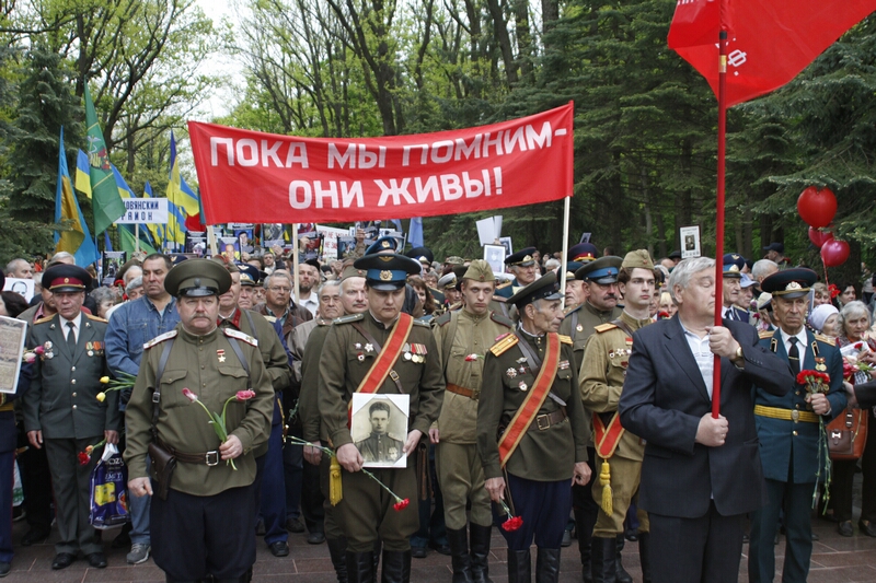 В толпе, устремившейся возлагать цветы, над головами «гордо реяли» портреты с георгиевскими ленточками и надписями «Бессмертный полк». Как туда затесались портреты героев погибших во время проведения АТО — остается загадкой. Но ветераны современной войны, которые принесли портреты своих побратимов, очень скоро вышли из пропитанной коммунистическими идеями толпы и стали в стороне от памятника.