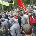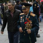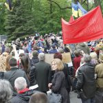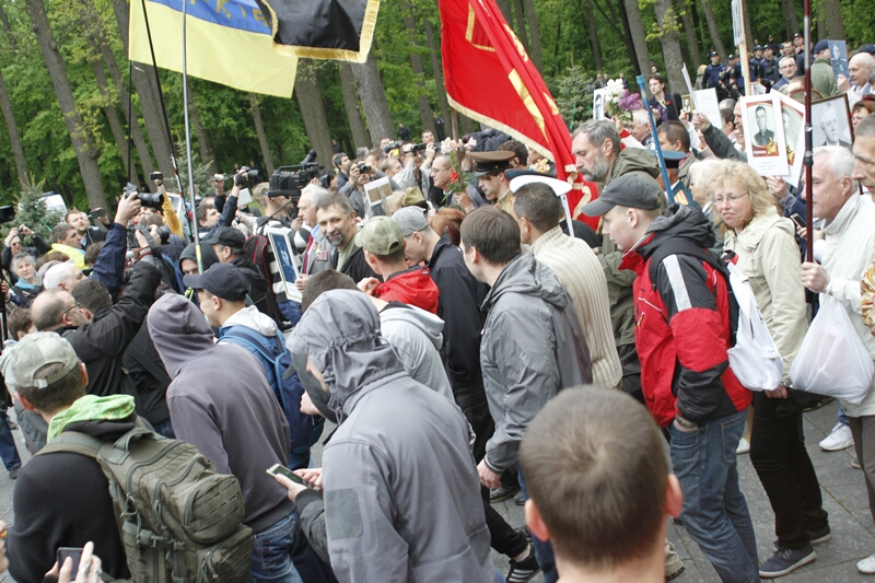 «Идеологически правильно» подкованная советскими идеями толпа периодически срывалась на скандирование лозунгов: «Фашизм не пройдет», «С Днем Победы». Ветераны АТО не могли не согласиться с таким подходом к лозунгам и предлагали в ответ согласиться с их более согласованным «Слава Украине!»